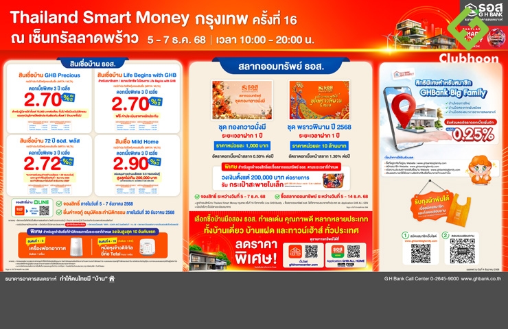 ธนาคารอาคารสงเคราะห์ (ธอส.) ยกขบวนโปรโมชันเด็ด จัดหนัก ในงาน “Thailand Smart Money กรุงเทพฯ ครั้งที่ 16” ซื้อ/ปลูกสร้าง/รีไฟแนนซ์ อัตราดอกเบี้ยพิเศษนาน 72 เดือน ผ่อนเริ่มต้นเพียงล้านละ 2,800 บาท