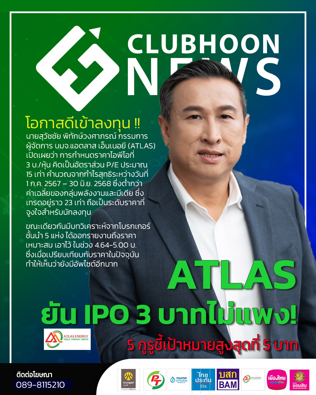 ATLAS ยันหุ้นไอพีโอ 3 บาทไม่แพง! ราคานี้พีอีแค่ 15 เท่าเทียบจากค่าเฉลี่ยของกลุ่มพลังงาน-มีเดียที่ 23 เท่าชี้เป็นโอกาสดีเข้าลงทุน 5 กูรูชี้เป้าหมายสูงสุดที่ 5 บาท