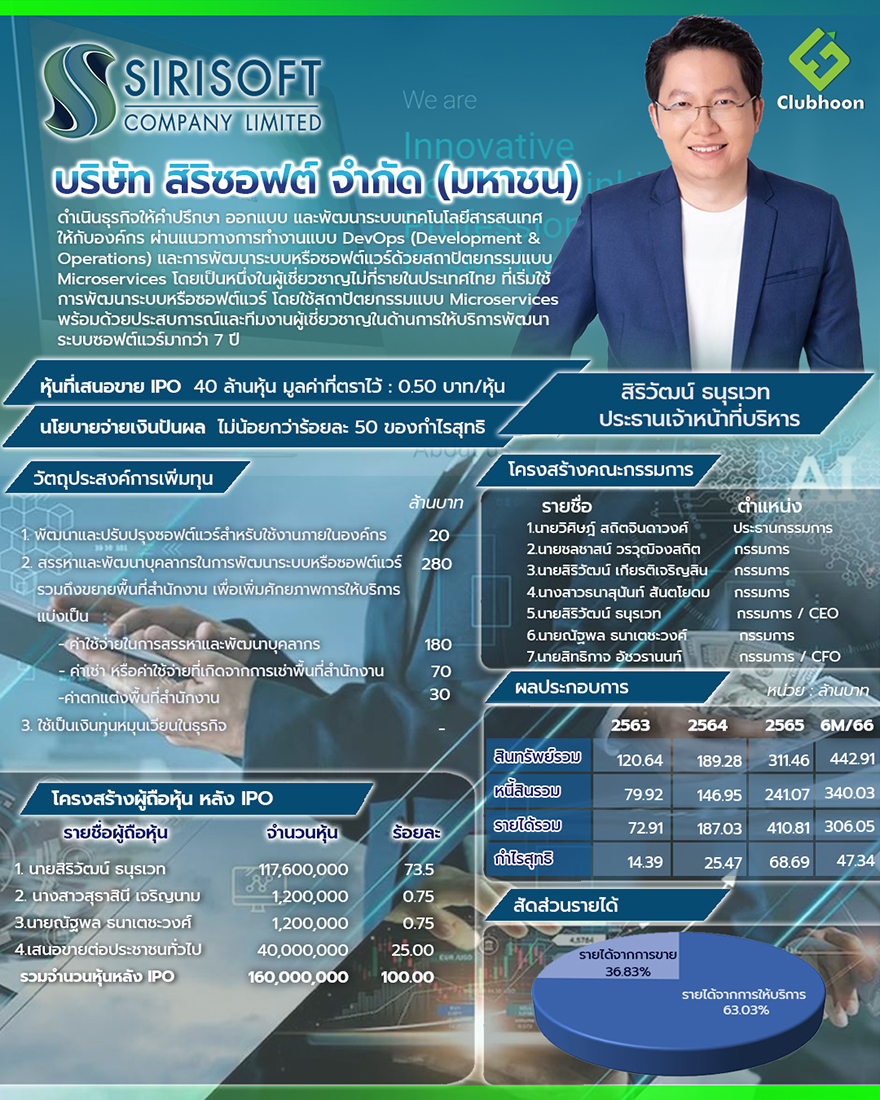 หลังจาก บริษัท สิริซอฟต์ จำกัด (มหาชน) หรือ SRS จัดโรดโชว์ นำเสนอข้อมูลสรุปการเสนอขายหุ้น IPO จำนวน 40 ล้านหุ้น เมื่อวันที่ 12 กันยายน ที่ผ่านมา ซึ่งนักลงทุนให้การตอบรับอย่างคับคั่ง ตอนนี้ก็ใกล้จะได้ฤกษ์ เคาะราคาจอง พร้อมกำหนดวันเปิดให้จองซื้อในเร็วๆ นี้ Clubhoon จะชวนท่านนักลงทุนไปทำความรู้จัก ว่าที่หุ้นน้องใหม่ กลุ่ม TECH ที่จะเข้าจดทะเบียนในตลาดหลักทรัพย์เอ็ม เอ ไอ (mai) เกี่ยวกับรายละเอียดการดำเนินธุรกิจ จุดเด่น และโอกาสการเติบโตของบริษัทในอนาคต