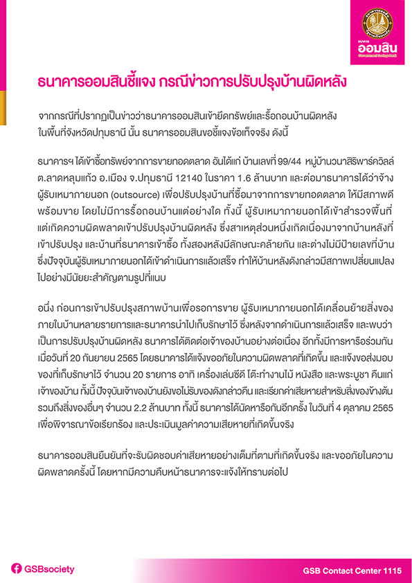 อนึ่ง ก่อนการเข้าปรับปรุงสภาพบ้านเพื่อรอการขาย ผู้รับเหมาภายนอกได้เคลื่อนย้ายสิ่งของภายในบ้านหลายรายการ และธนาคารนำไปเก็บรักษาไว้ ซึ่งหลังจากดำเนินการแล้วเสร็จ และพบว่าเป็นการปรับปรุงบ้านผิดหลัง ธนาคารได้ติดต่อเจ้าของบ้านอย่างต่อเนื่อง อีกทั้งมีการหารือร่วมกันเมื่อวันที่ 20 กันยายน 2565 โดยธนาคารได้แจ้งขออภัยในความผิดพลาดที่เกิดขึ้น และแจ้งขอส่งมอบของที่เก็บรักษาไว้ จำนวน 20 รายการ อาทิ เครื่องเล่นซีดี โต๊ะทำงานไม้ หนังสือ และพระบูชา คืนแก่เจ้าของบ้าน ทั้งนี้ ปัจจุบันเจ้าของบ้านยังขอไม่รับของดังกล่าวคืน และเรียกค่าเสียหายสำหรับสิ่งของข้างต้น รวมถึงสิ่งของอื่นๆ จำนวน 2.2 ล้านบาท ทั้งนี้ ธนาคารได้นัดหารือกันอีกครั้งในวันที่ 4 ตุลาคม 2565 เพื่อพิจารณาข้อเรียกร้อง และประเมินมูลค่าความเสียหายที่เกิดขึ้นจริง