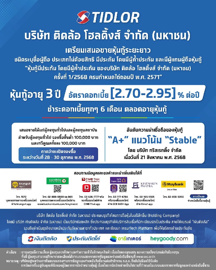 โดยหุ้นกู้ได้รับการจัดอันดับความน่าเชื่อถือที่ระดับ "A+" แนวโน้มอันดับเครดิต "คงที่" จาก บริษัท ทริสเรทติ้ง จำกัด เมื่อวันที่ 21 สิงหาคม 2568 สะท้อนถึงความแข็งแกร่งหลังการปรับโครงสร้างธุรกิจของ บมจ.ติดล้อ โฮลดิ้งส์ และบริษัทในกลุ่ม โดยเฉพาะบริษัทย่อยหลัก อย่าง บมจ.เงินติดล้อ ในฐานะผู้ให้บริการชั้นนำทั้งในธุรกิจสินเชื่อทะเบียนรถและธุรกิจนายหน้าประกันภัย นอกจากนี้ TIDLOR ยังมีธนาคารกรุงศรี (BAY) เป็นผู้ถือหุ้นรายใหญ่ จึงช่วยสร้างความมั่นใจให้กับผู้ลงทุนได้เป็นอย่างดี