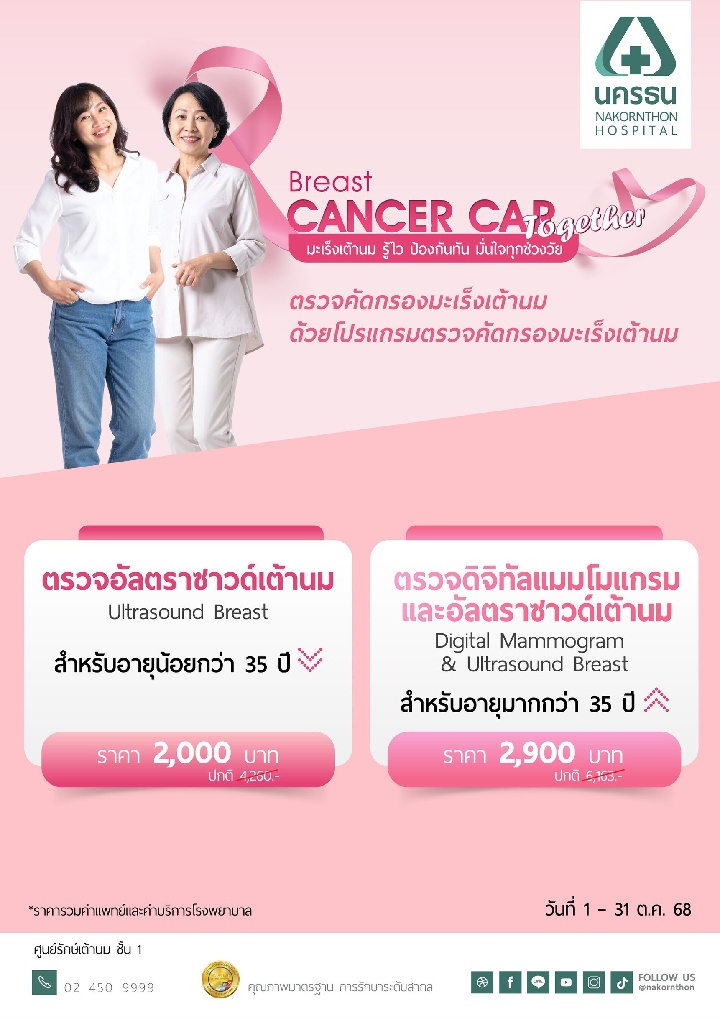 ทั้งนี้ เพื่อรณรงค์วันมะเร็งเต้านมโลก ซึ่งตรงกับวันที่ 7 ตุลาคมของทุกปี โรงพยาบาลนครธน ได้จัดโปรแกรมตรวจคัดกรองมะเร็งเต้านม 1. ตรวจอัลตราซาวด์เต้านม ราคา 1,900 บาท 2. ตรวจด้วยเครื่องดิจิทัลแมมโมแกรมและอัลตราซาวด์เต้านม ราคา 2,900 บาท เปิดให้สั่งซื้อผ่านเว็บไซต์ www.nakornthon.com ตั้งแต่วันที่ 1 – 31 ตุลาคม 2568