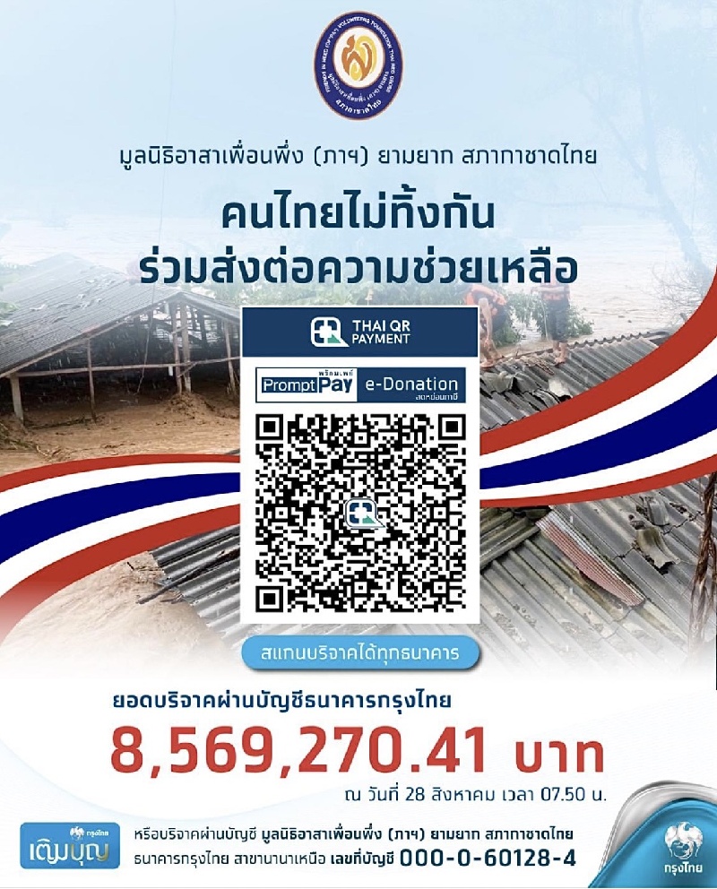 ทั้งนี้ ผู้มีจิตศรัทธาสามารถร่วมบริจาค เพื่อส่งต่อความช่วยเหลือให้แก่ผู้ประสบอุทกภัย ผ่านมูลนิธิอาสาเพื่อนพึ่ง (ภาฯ) ยามยาก สภากาชาดไทย ด้วยการสแกน QR Code E-Donation ผ่านแอปพลิเคชันของทุกธนาคาร ซึ่งข้อมูลการบริจาคจะส่งเข้าระบบลดหย่อนภาษีของกรมสรรพากรอัตโนมัติ หรือบริจาคผ่านบัญชี ออมทรัพย์ ชื่อบัญชี มูลนิธิอาสาเพื่อนพึ่ง (ภาฯ) ยามยาก สภากาชาดไทย ธนาคารกรุงไทย สาขานานาเหนือ เลขที่ 000-0-601-28-4 หรือดูรายละเอียดเพิ่มเติมได้ที่ https://krungthai.com/link/edonation-flood2024-fb