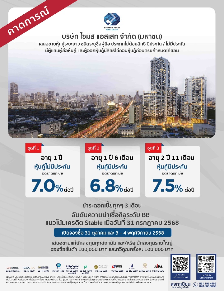 "ไซมิส แอสเสท" ประสบความสำเร็จในการระดมทุนหุ้นกู้ ล่าสุดเตรียมเสนอขายหุ้นกู้ 3 ชุดใหม่ ชูอัตราดอกเบี้ยสูงสุด 7.5% คาดเปิดให้จองซื้อระหว่างวันที่ 31 ต.ค. และ 3–4 พ.ย. 68 ย้ำกลยุทธ์ “Asset of Life” มุ่งสร้างกำไรให้ชีวิตทั้งด้านการอยู่อาศัยและการลงทุน